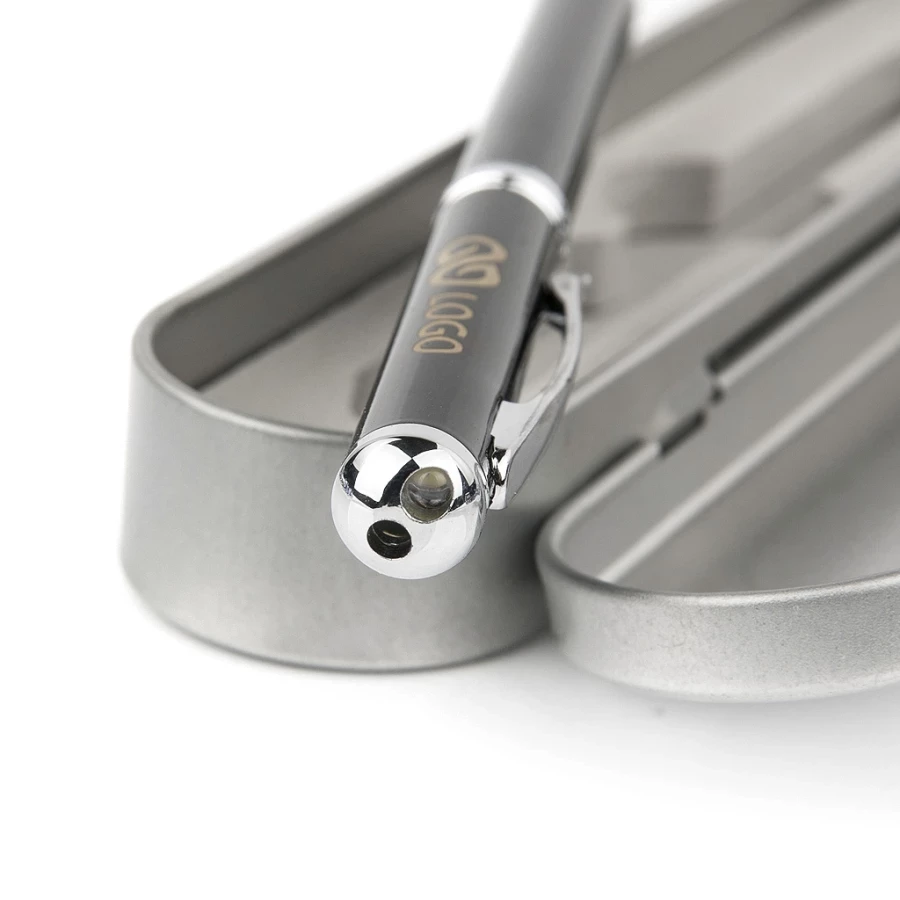 Oglaševalsko pero je lahko izjemno elegantno oblikovano, zato ga stranke povezujejo s sodobnim pristopom in strokovnostjo. Prepričani smo, da bo tako tudi v primeru pisala Laser Touch Case. Ta majhen komplet je videti zelo elitno in elegantno. Tako ohišje pisala kot samo ohišje sta izdelana iz kovine, kar nam omogoča lasersko graviranje poljubnega napisa ali logotipa nanju. Promocijsko pisalo Laser Touch v etui je idealno kot darilo za dolgoletne stranke ali kot znak hvaležnosti za sodelavce.
